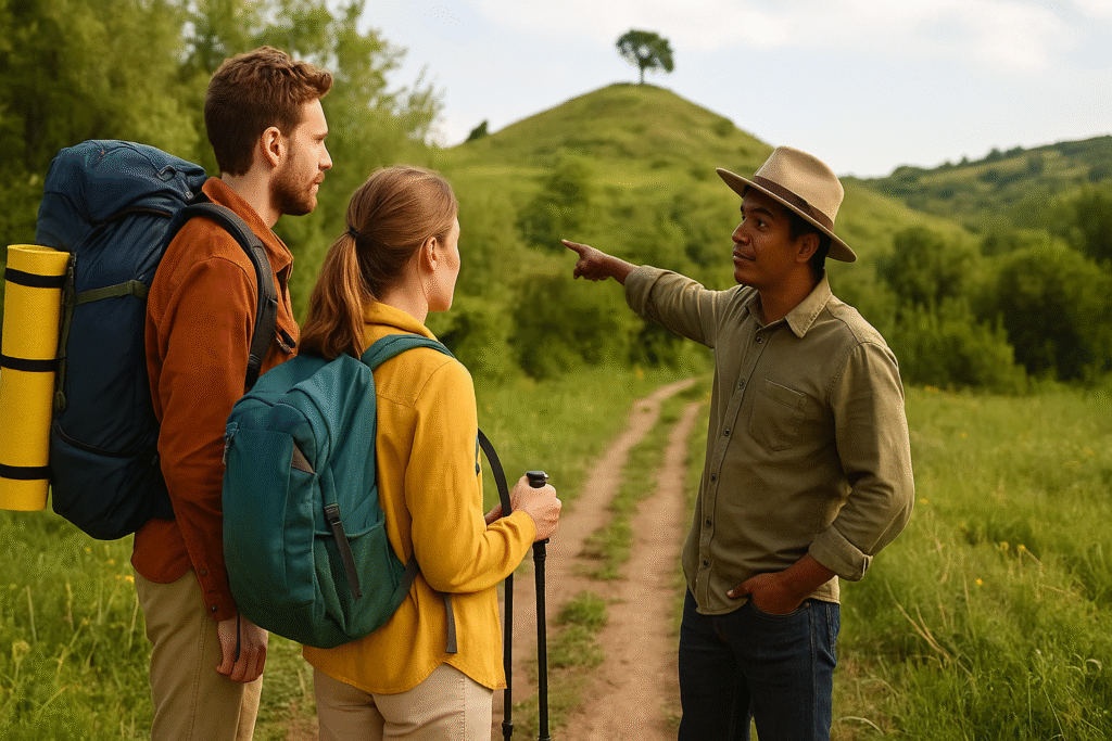 B Yes, turn right after that hill. Walk for a couple of miles, and you’ll see the waterfall on the left.